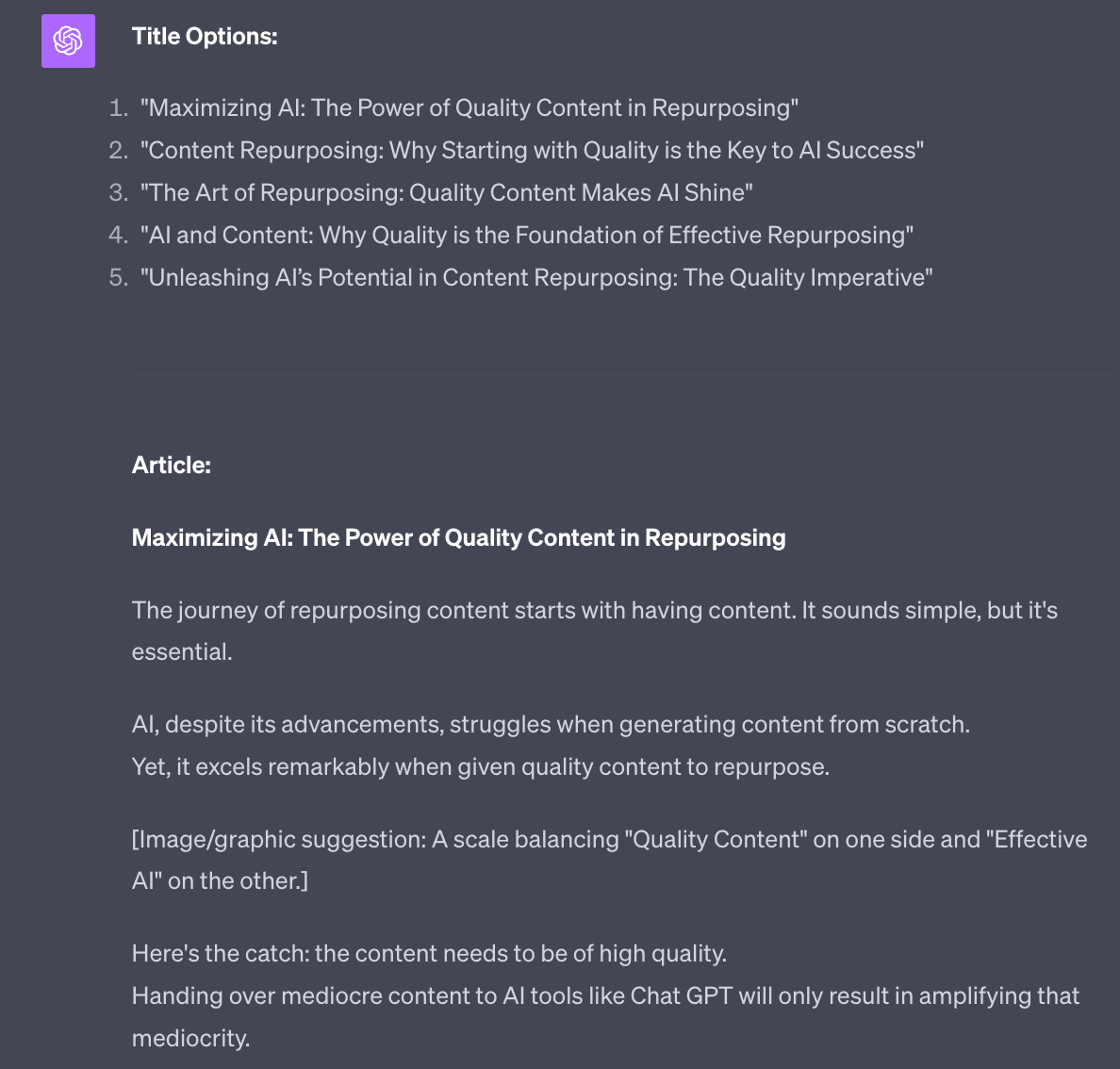 Alternatively, you may feel that you long form X isn’t quite right for LinkedIn. If that’s the case here’s a prompt to generate the LinkedIn article from scratch for you. Try both and compare results.