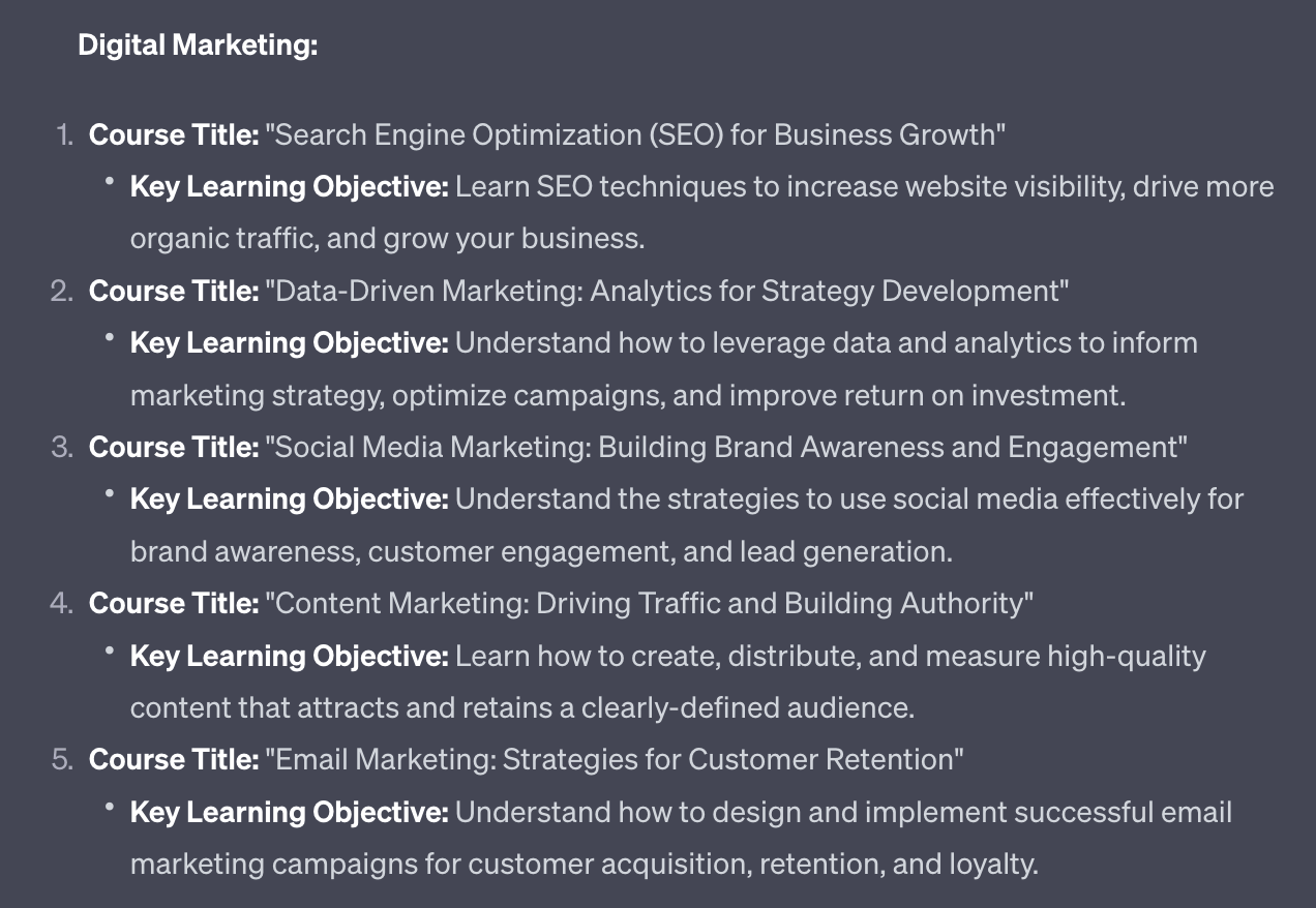 Please also suggest a key learning objective for each course.Where the prompt says [Insert skills/knowledge] add as many of your areas of expertise as possible. The more you add the more ideas ChatGPT will throw at you.
