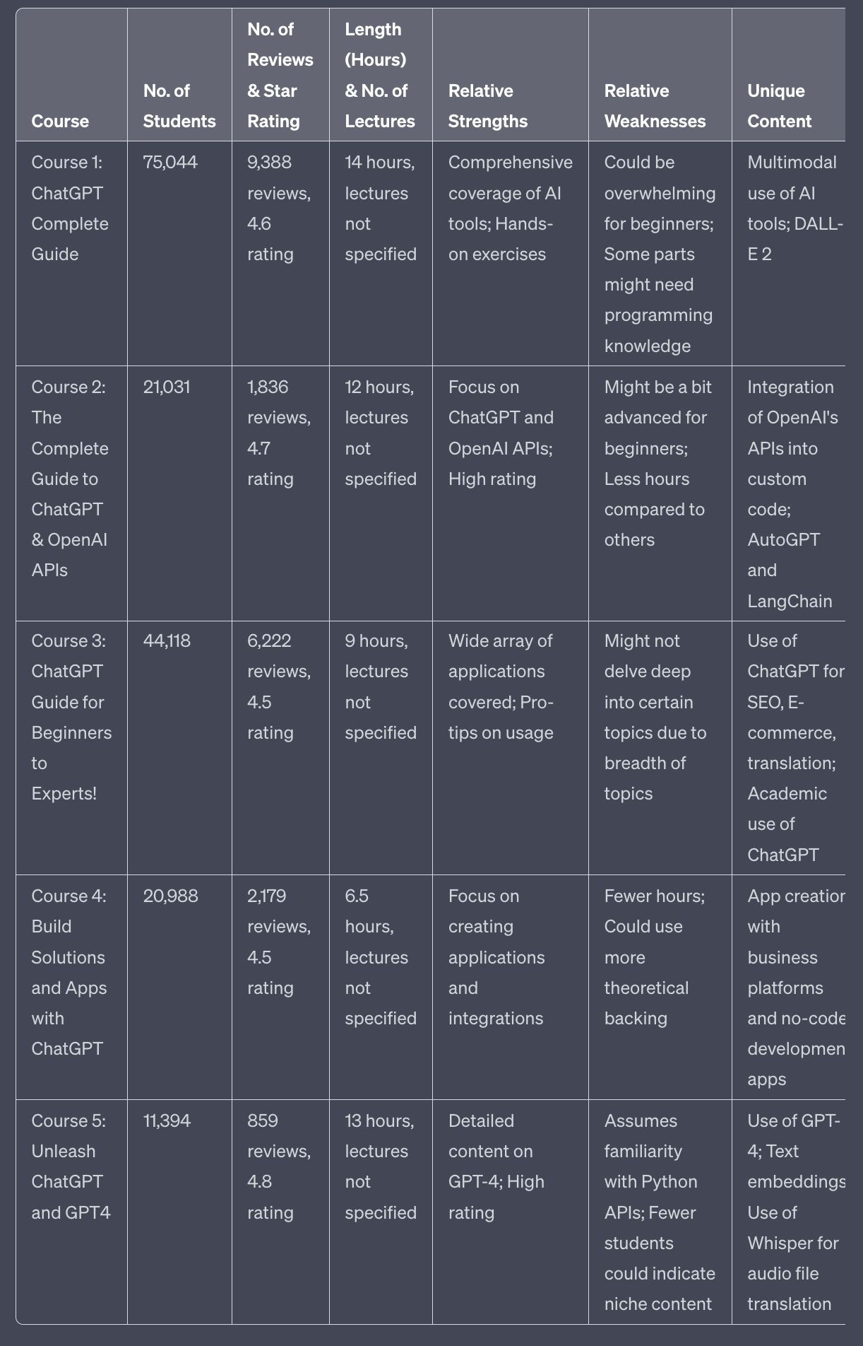 This gives us a comparative analysis of the top 5 Udemy courses in our niche.