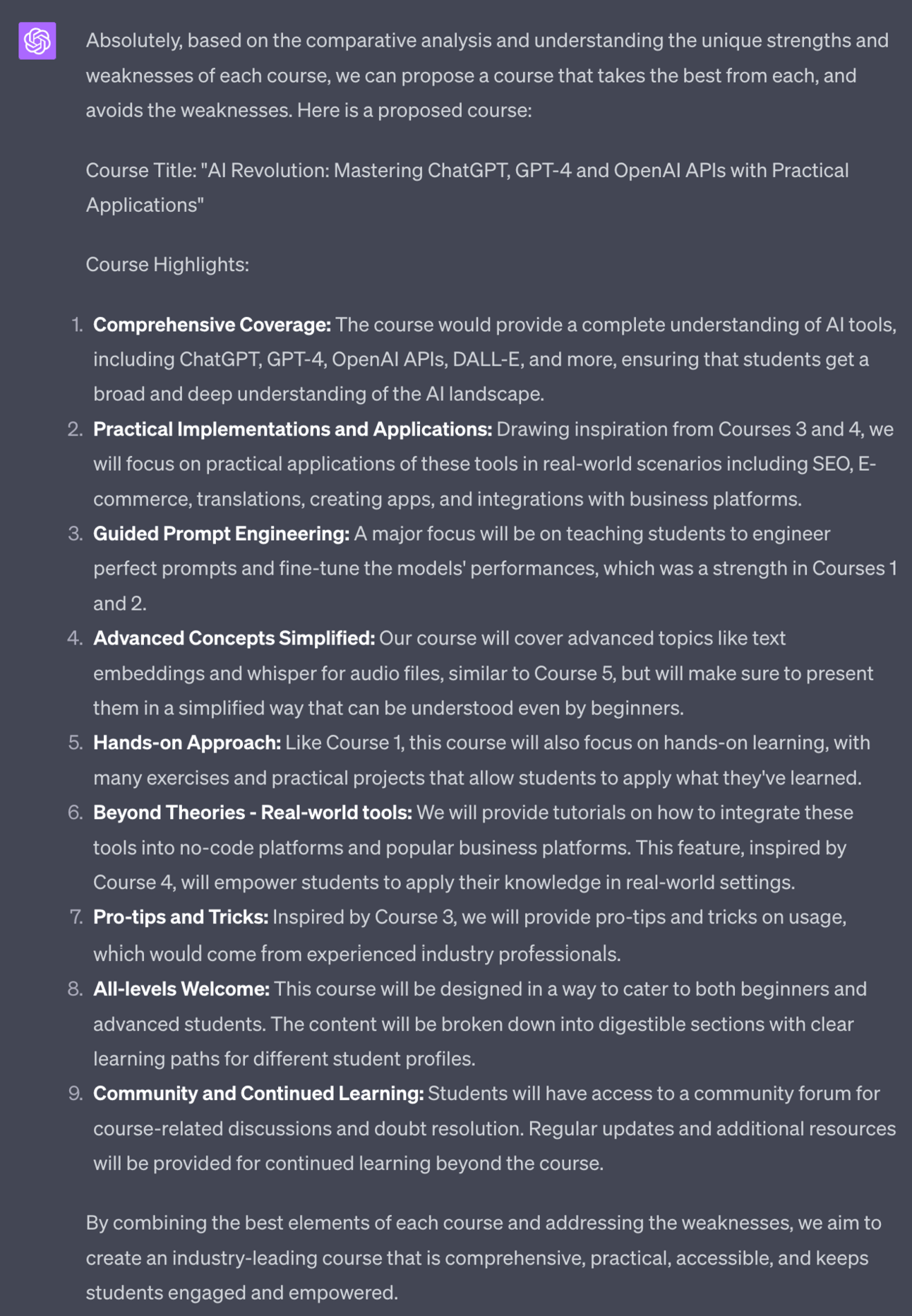 This prompt takes all of the competitor information you provided, all the strengths and weaknesses, and suggests a course that is better than the others.