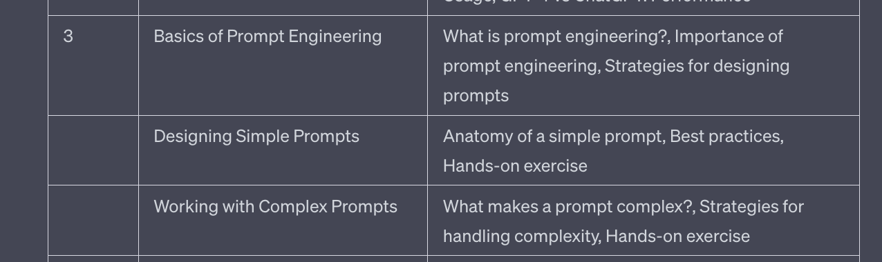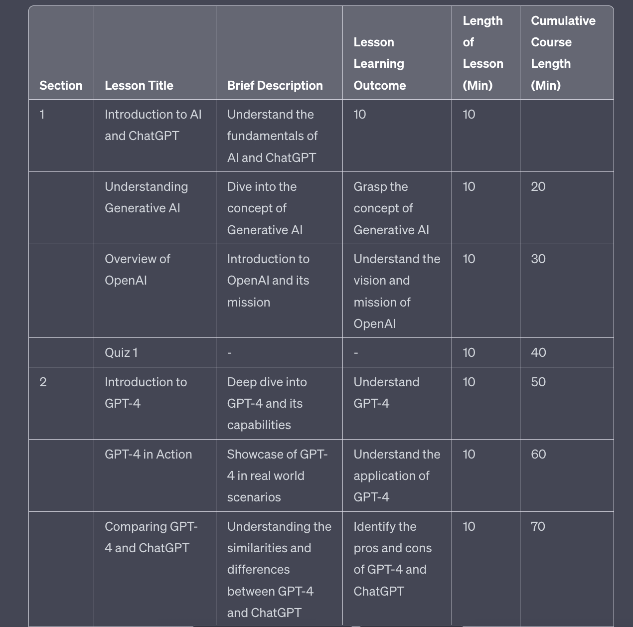 ChatGPT will create a table of your course’s structure. This will be very long - so here’s just a sample of the top of my table: