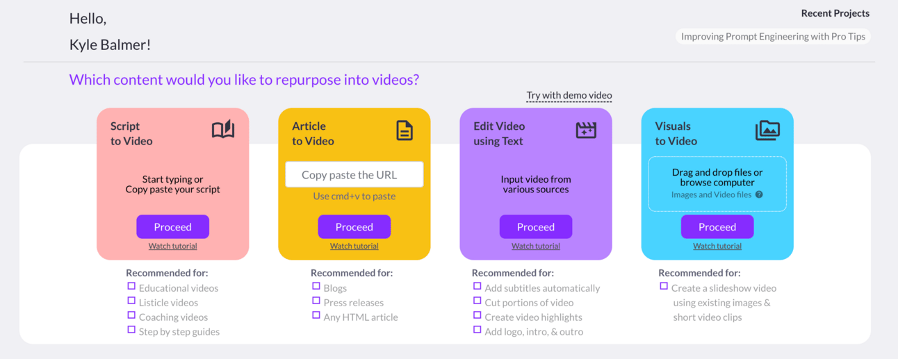 Pictory is a new kid on the block and uses AI to produce videos much faster than if you were manually putting them together.