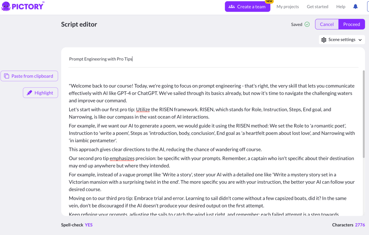 Provide spoken script onlyCopy this stripped down version of the script into Pictory and hit Proceed.