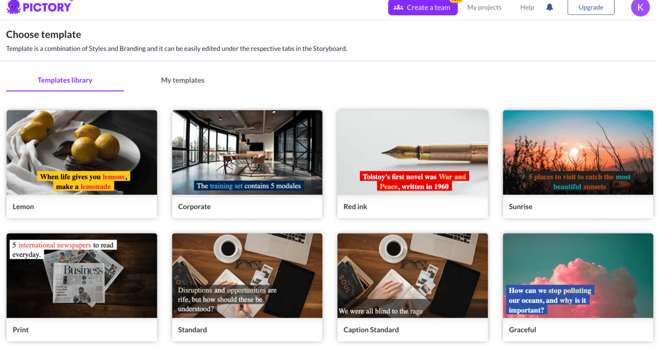 Next, Pictory will give you a selection of templates. Don’t sweat this too much as we can change it in the editor later. It’s not final so just choose one you like the look of for now.