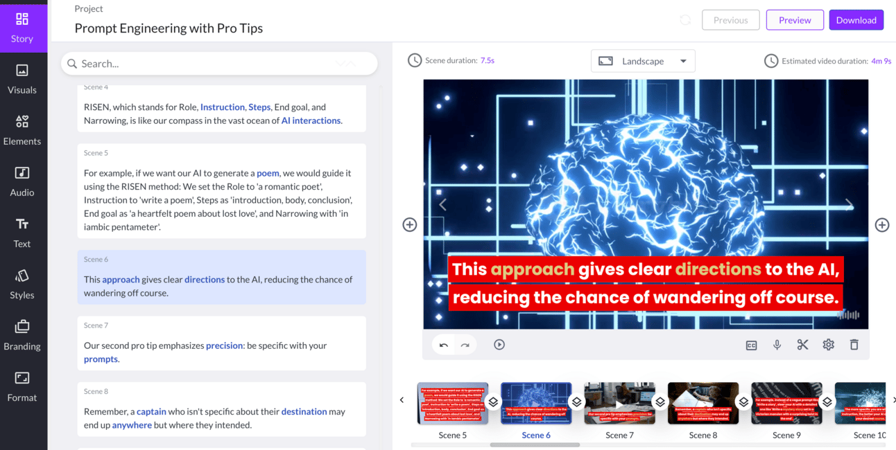 The scripts we have prepared, complete with image suggestions and time codes, are fleshed out enough to be used in any format. The extra detail will be invaluable in manual editing in particular. When using AI tools like Pictory though we’ll just strip that info out quickly.