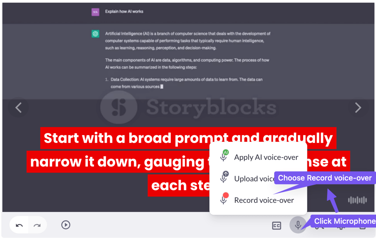 It’s decision time now. You can either use one of Pictory’s built in AI voices or record your own narration.
