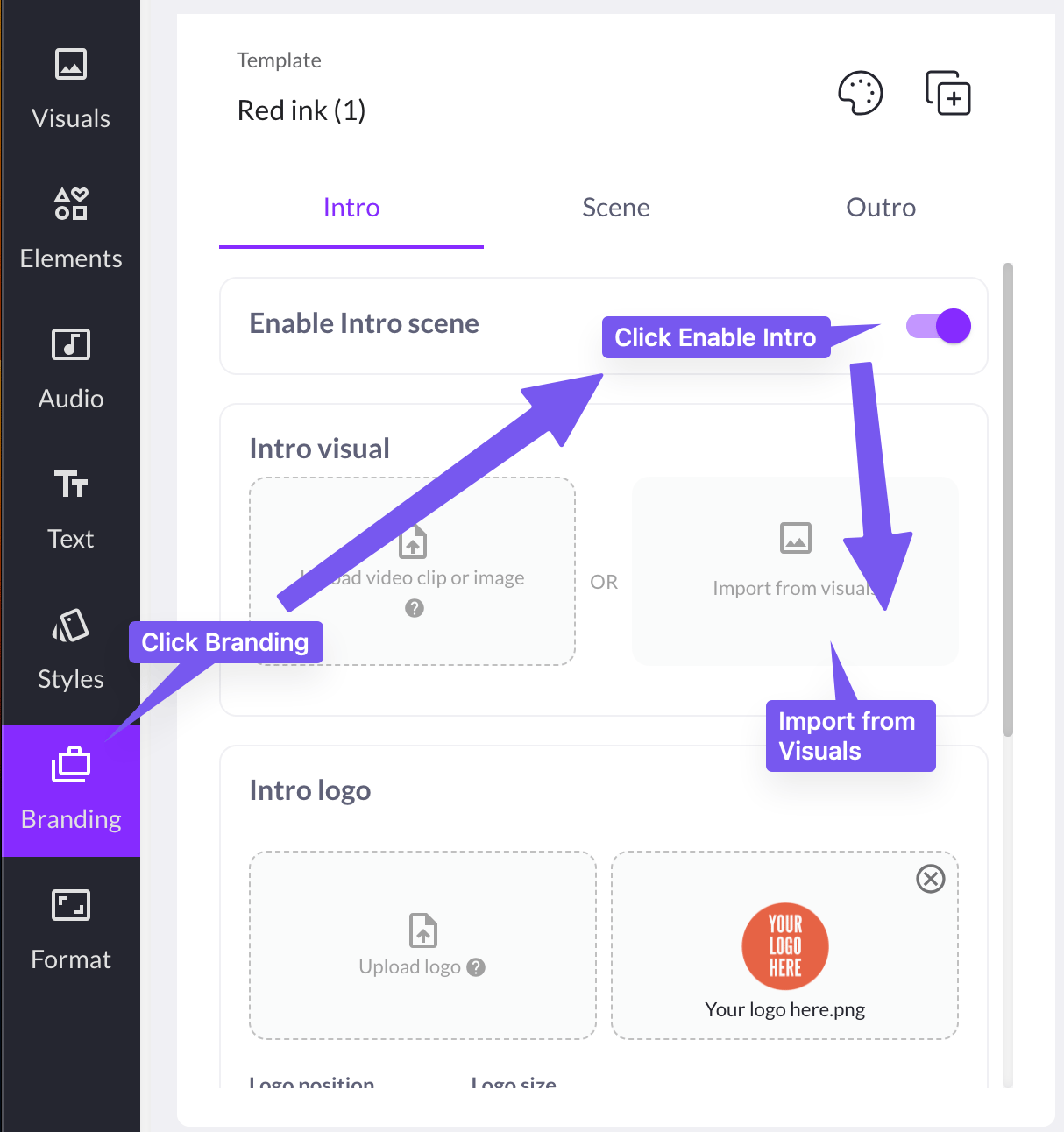 There may already be an intro template in place. Delete the default and choose Import from Visuals.