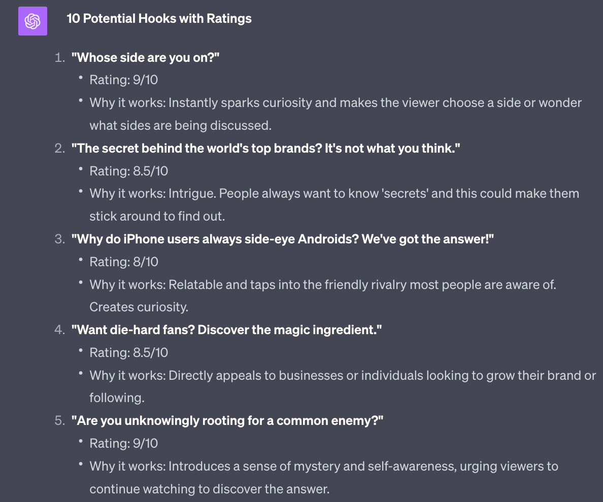 Asking ChatGPT to provide ratings and reasons helps us to filter the hooks. It also forces ChatGPT to analyse its own work.