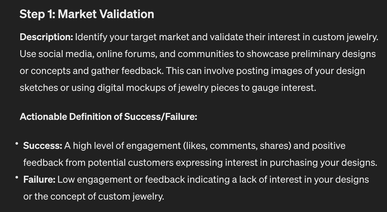 For each step provide a description and precise, actionable definition of success/failureI’ll run this prompt with “selling custom jewellery”. It gives me 5 steps.