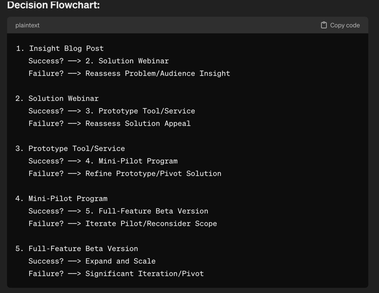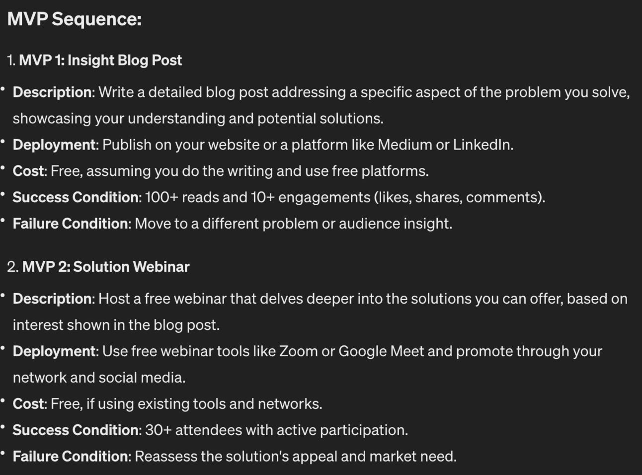Each MVP idea should be fast (<1 day) to deploy, cost less than $100 and have a success/failure condition.