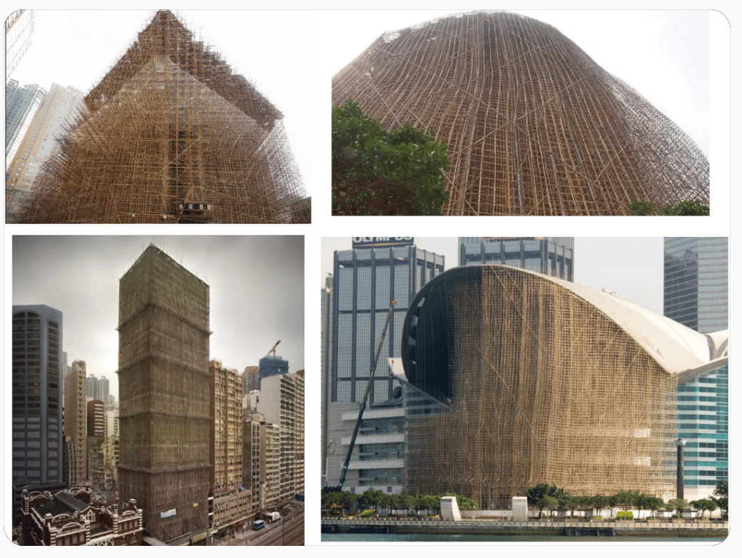 In the East though, especially in typhoon prone regions like Hong Kong, they use bamboo scaffolding.