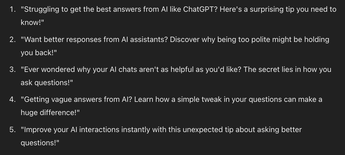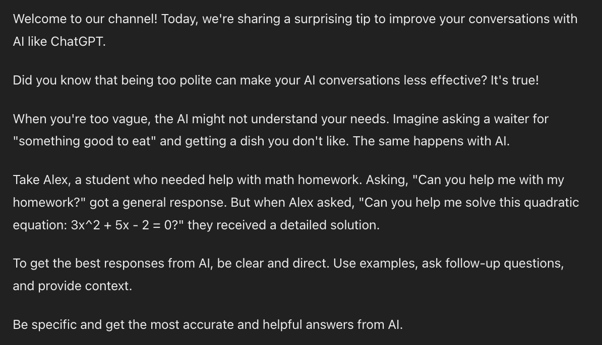 Provide 5 hook alternativesThe prompt will generate a much more concise script for you, again allowing you to adjust for detail.