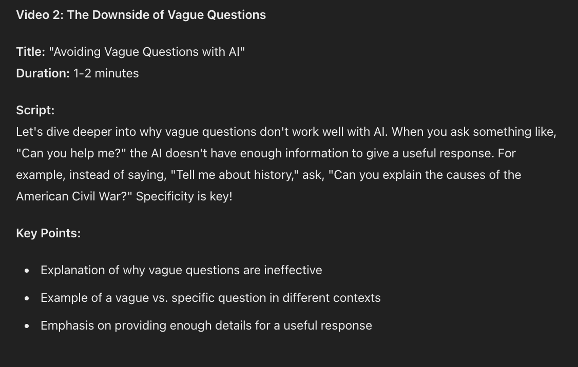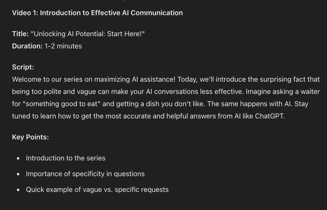 The series should be 5 short videos of 1-2 minutes eachWhen I use this with the information about not being overly polite to ChatGPT I’m given multiple short videos like so: