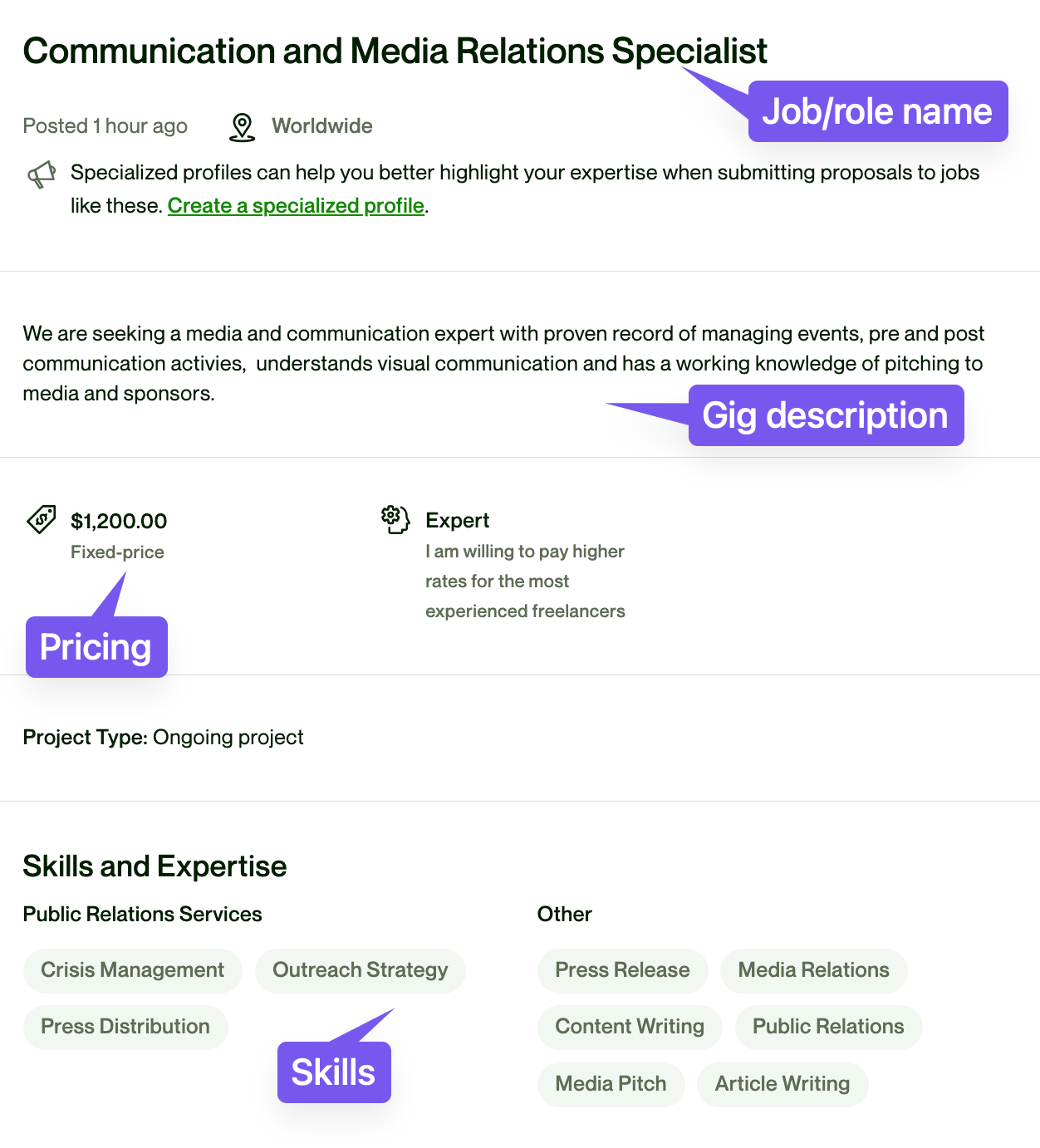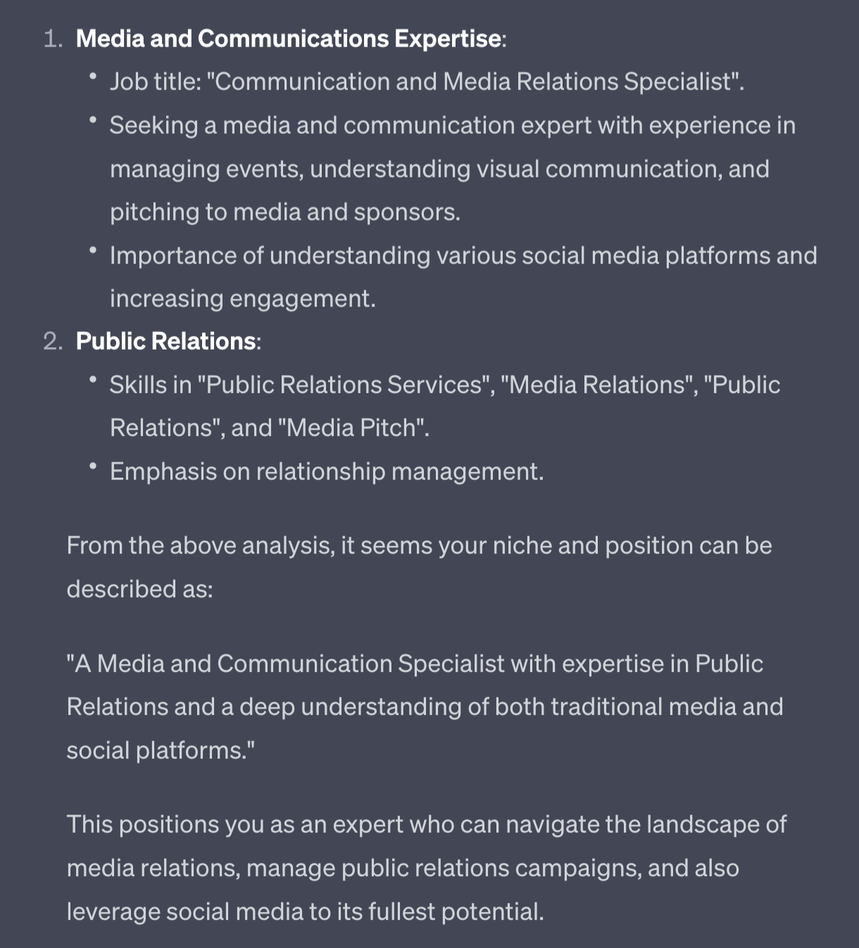 ChatGPT will reverse engineer from the jobs your selected as potential and start to work out your niche focus. It looks for commonalities between the specified gigs and uses this to carve out your niche. The more gigs you provide the better the result will be - so take your time here.