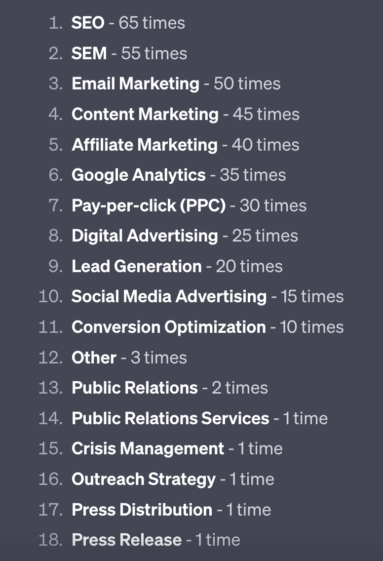 Remember that we looked for gigs that we know we can do and are interested in. We’re now reverse engineering back to a list of the top skills that those clients want.