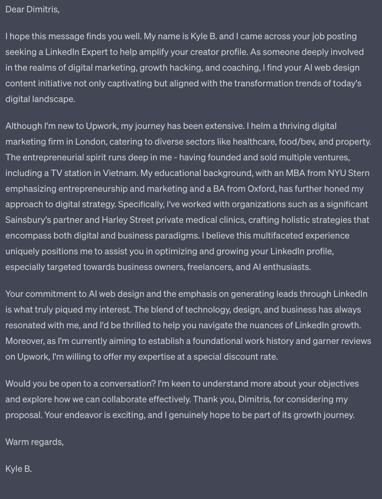 The more detail in the job description and your freelancer profile the better ChatGPT will be able to generate something unique.