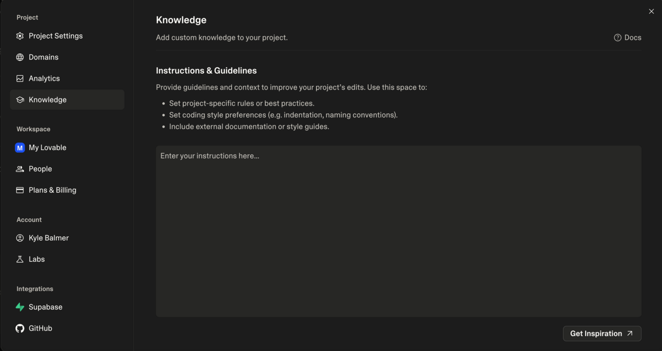 In Lovable, there's a "Knowledge" section in your project settings where you can add custom instructions. This is just like giving ChatGPT or any other AI system instructions - these become the rules Lovable follows throughout development.