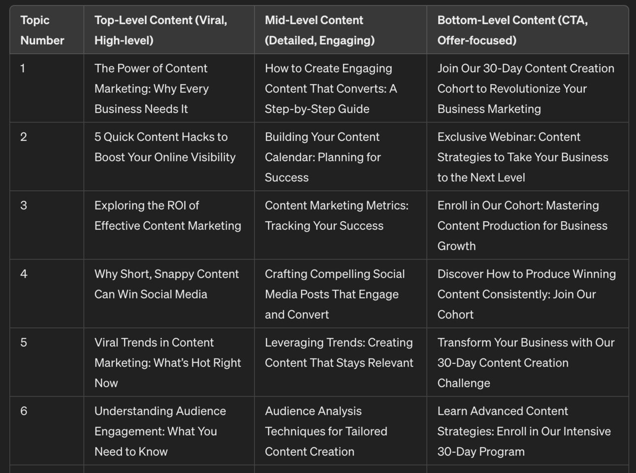 Generate 10 topics. Each topic should exist in all three levels. Provide results in tabular format. I’ve entered “building an audience to get their business known” as the problem.