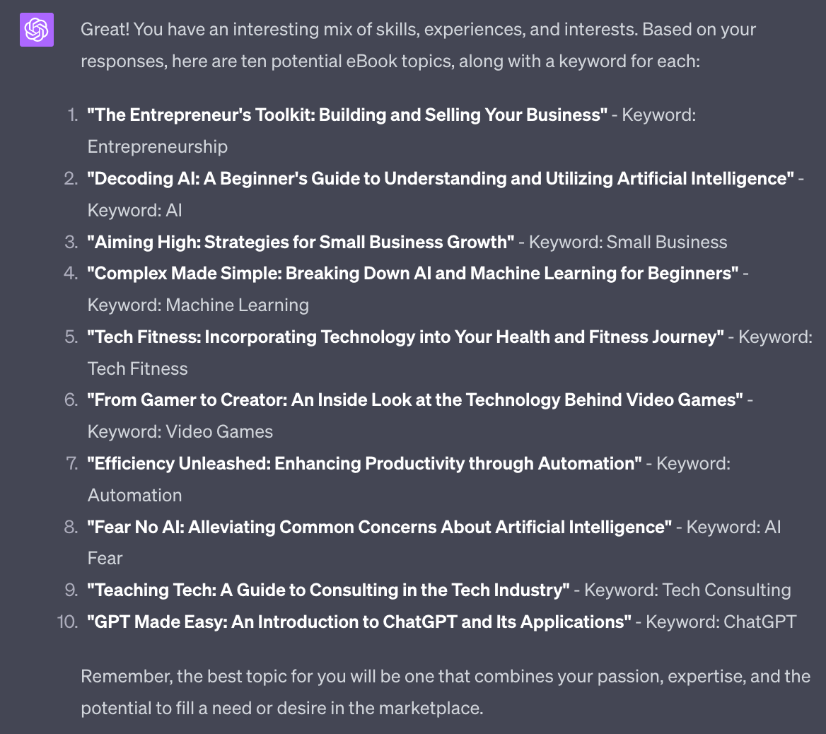 At the end of the questions use the information you have gathered to generate 10 potential topics that I could write about. Make them diverse to give me a range of options. For each also provide a keyword that describes the topic.