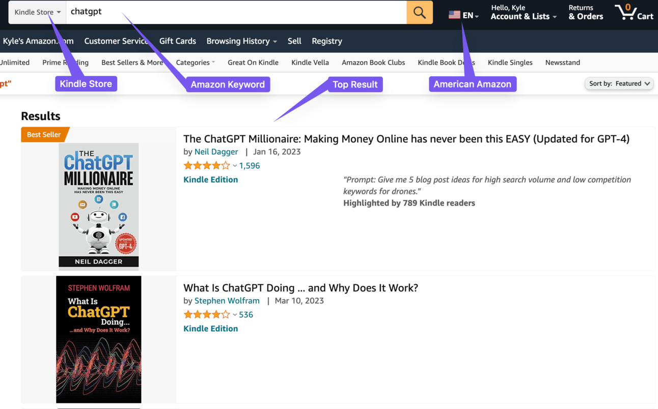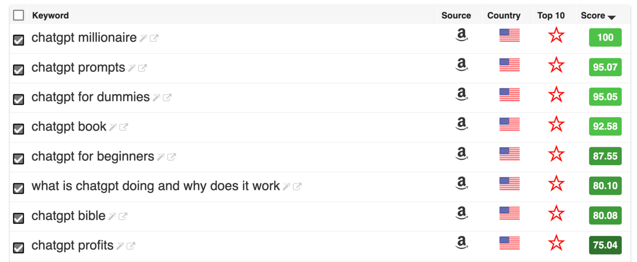 So for example from the seed keyword “ChatGPT” I now have the Amazon keywords “chatgpt millionaire”, “chatgpt prompts”, “chatgpt for dummies”, “chatgpt book” etc.