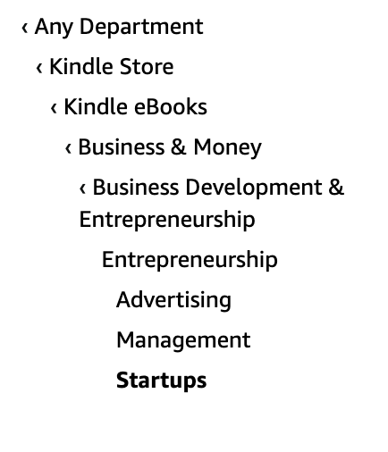 Here you can see the hierarchy is Kindle Store > Kindle eBooks > Business & Money > Business Development & Entrepreneurship > Startups