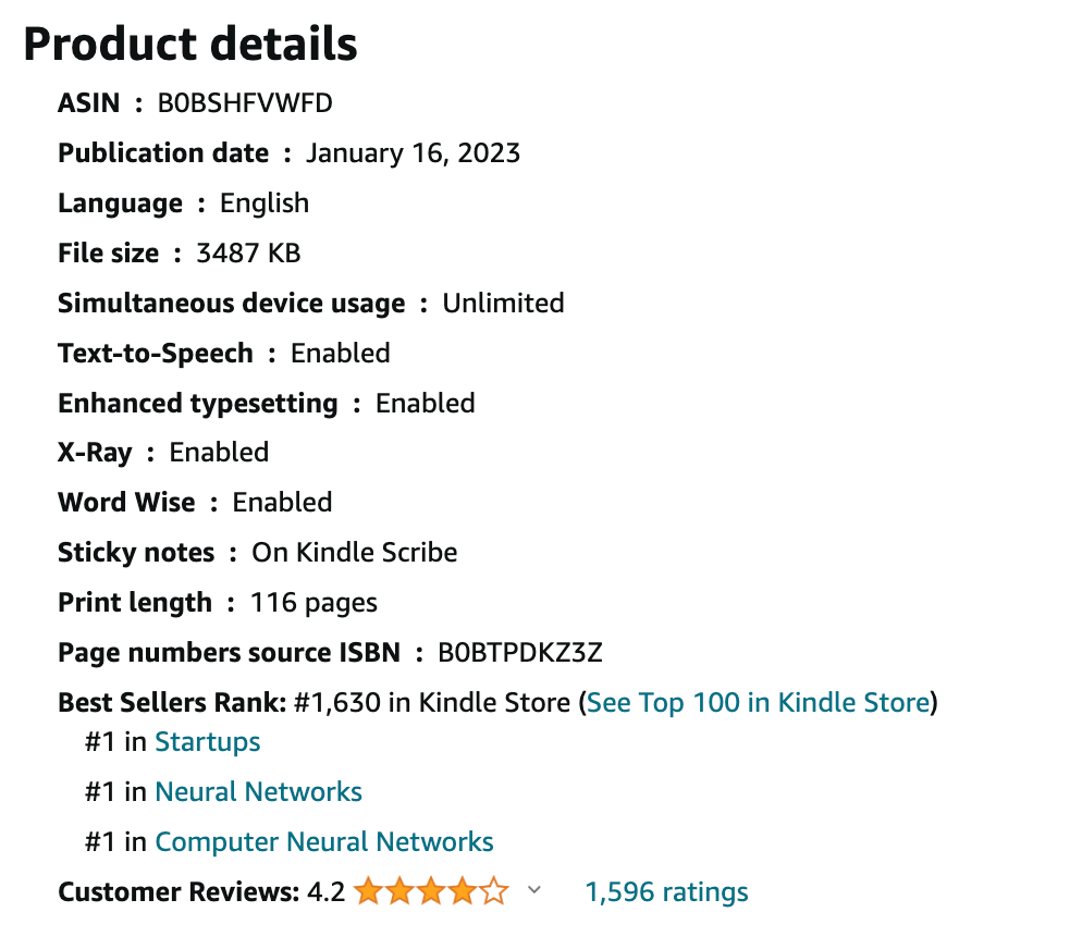 This shows me that this book is #1 in Startups, Neural Networks and Computer Neural Networks. These are Amazon categories.