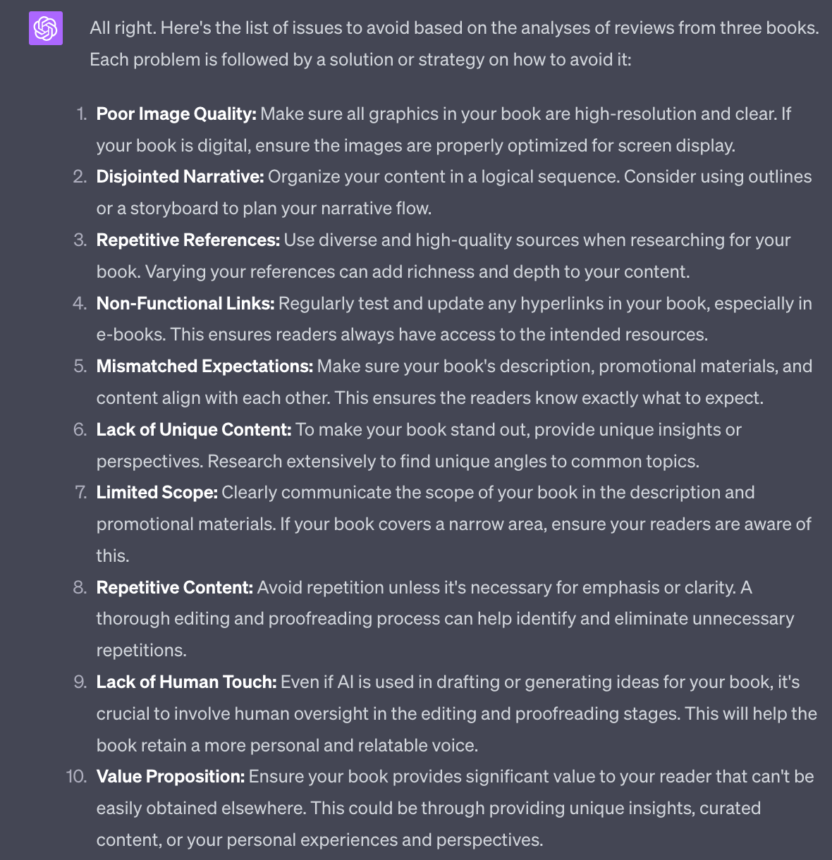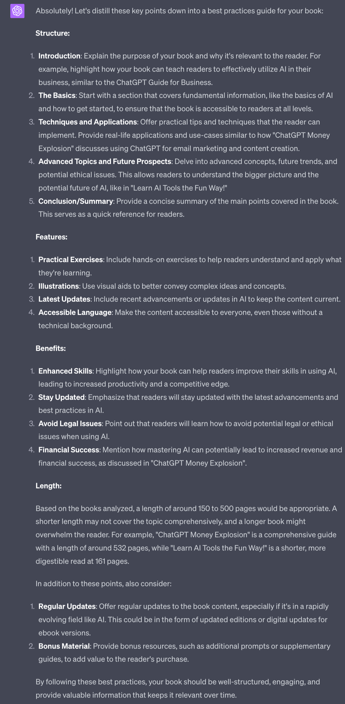 We now have some basic guidelines that we’re going to feed to ChatGPT to help us structure the book.
