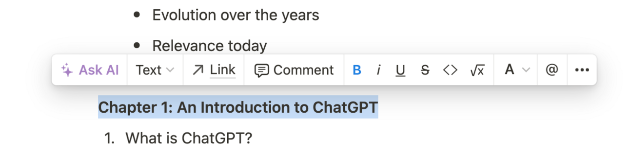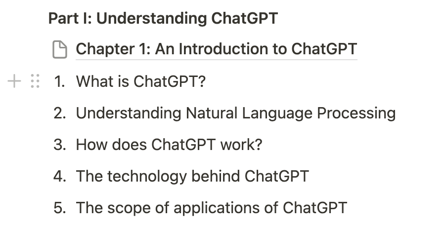 In this example Chapter 1: An Introduction to ChatGPT is now its own Page. It’s a sub-page of the main structure Page. I can now add the content specific to that chapter directly into the Chapter 1 sub-page.