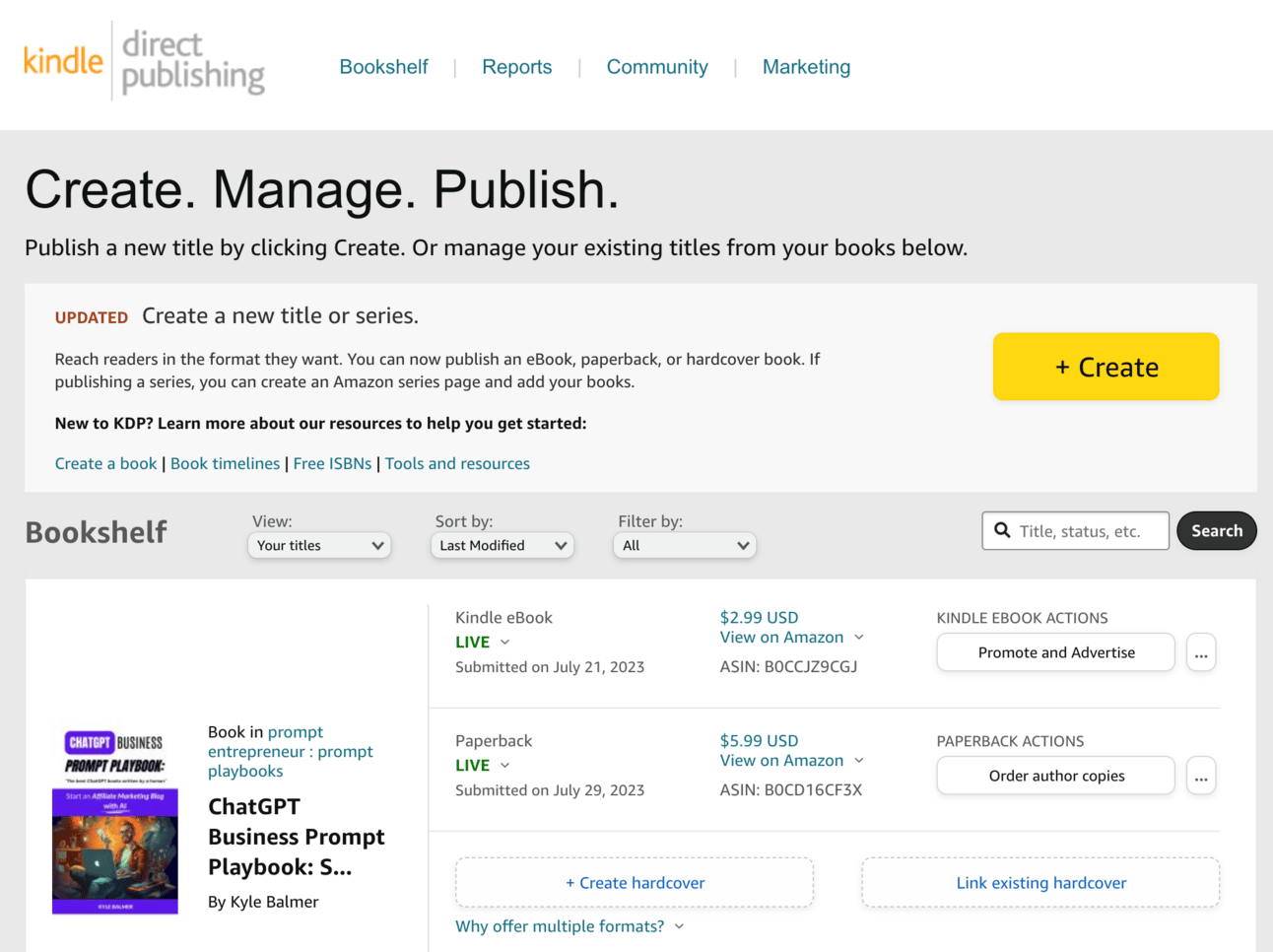 Go ahead and click Create eBook. Once you have sorted out your eBook Kindle version you can look at producing a Paperback version.
