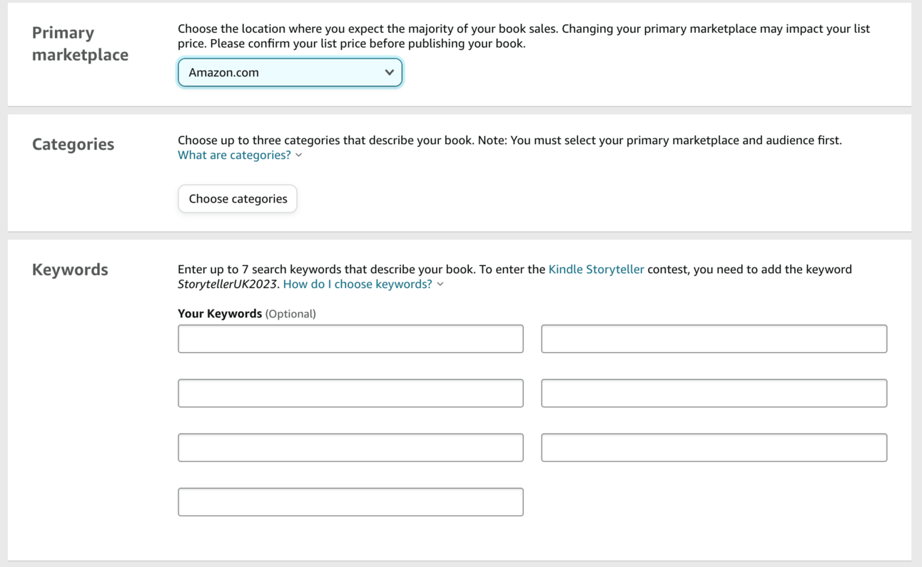 First up set your primary Marketplace to Amazon.com, the US Amazon. This will ensure widest reach. You’ll also be publishing on all the local Amazons but we want to optimise for the largest in the next step where we choose Category.