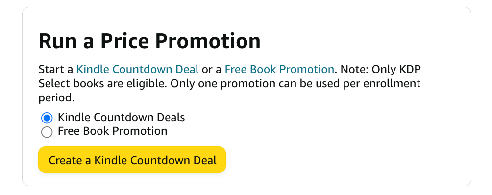 Once you’ve enrolled in Kindle Select schedule your free dates. You’ll need to wait until your book is published to be able to do this.