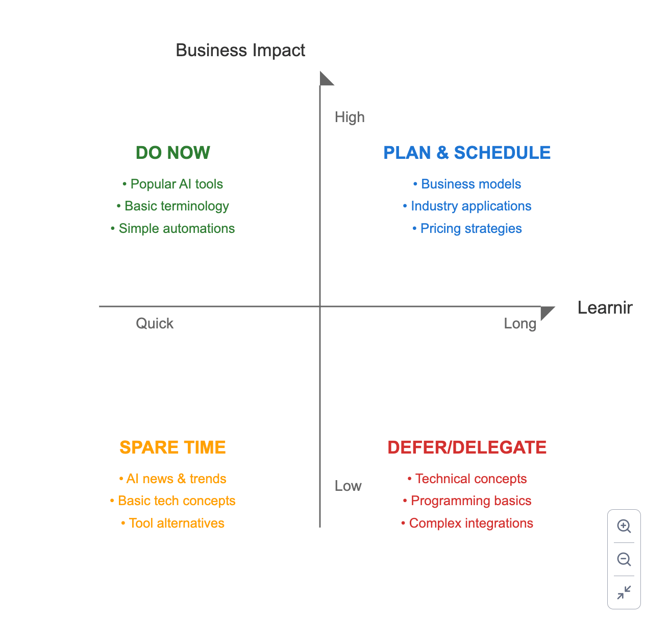 "AI Learning Priority Matrix" | Balancing time and learning | Customised learning roadmap based on business goals | 4 | 3 | 5 |