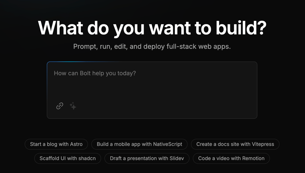 Think of Bolt as ChatGPT for building web apps. Instead of writing code, you describe what you want, and it builds it for you. The interface will feel familiar - it's just like chatting with an AI.