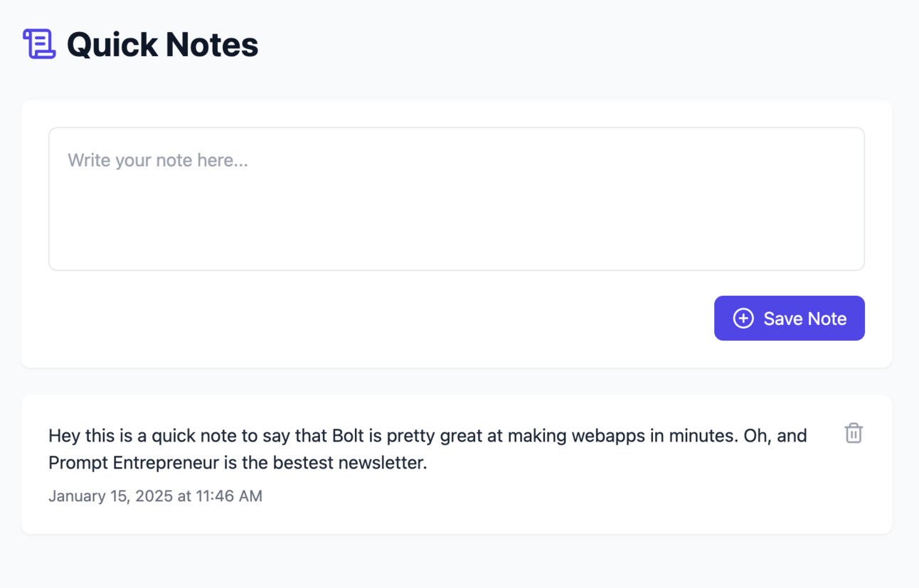 Let's build something simple to see how it works. How about a basic note-taking app? Here's what you might type: