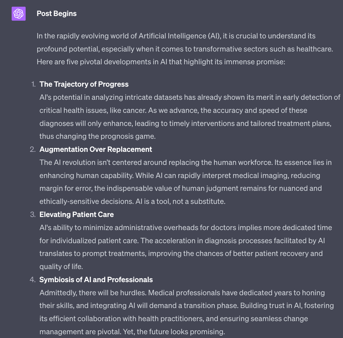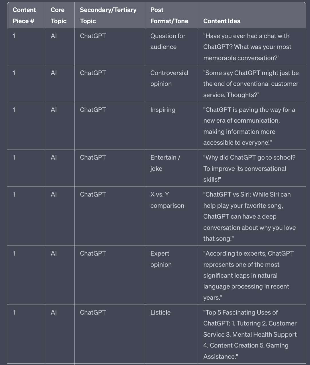 This output shows the large topic (AI) mixed with my first medium topic (ChatGPT). The full output will include all of your medium and small topics giving you ~50-100 post ideas depending on how many topics you put in.