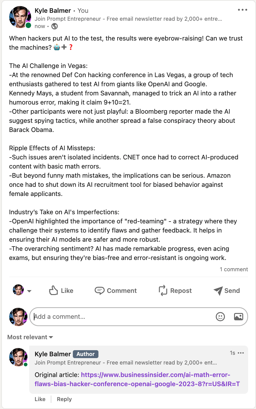 Make sure to link to the original article - do so in the Comments not the actual post. This is because LinkedIn’s algorithm deprioritises posts with links.