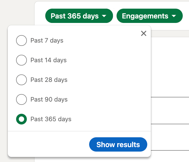 LinkedIn will export the data type and date range you select so set it to 365 days and Engagements like so: