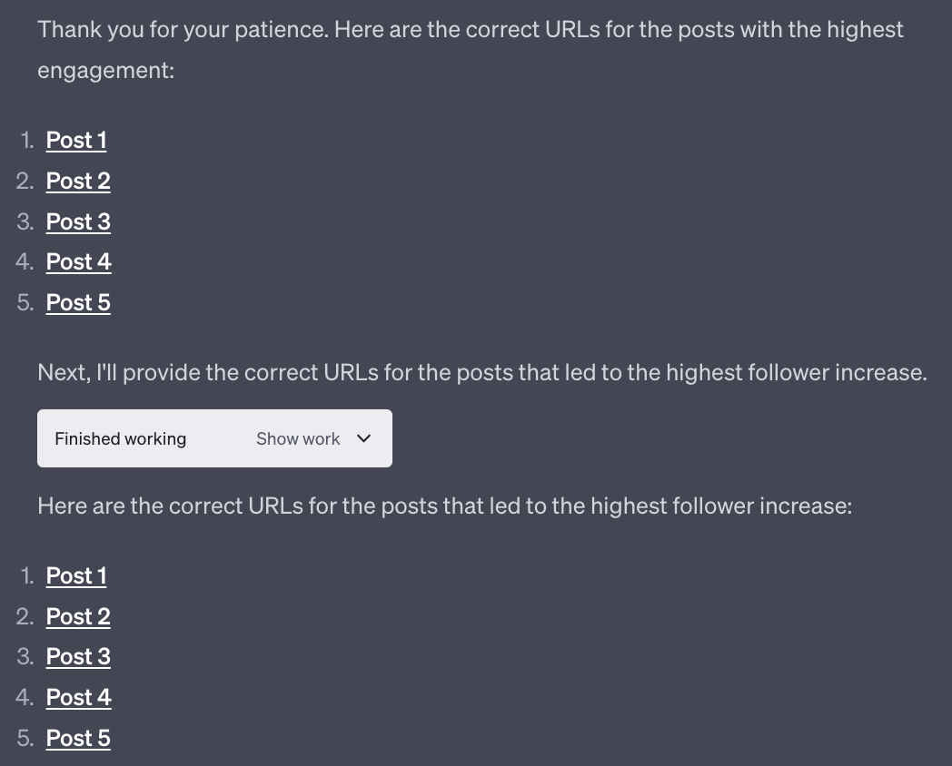 There’s a chance that the links ChatGPT provides will not work - this has happened to me and students a few times. If so just use “the links provided do not exist in the dataset” and ChatGPT will go back and fix the links - just a weird bug.
