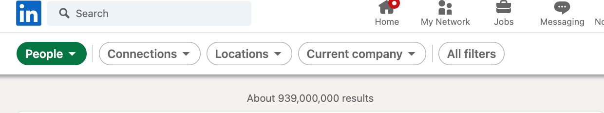 Basically when we use the Search bar to get to the Search page it will be filtered to that keyword. We want a clean, unfiltered Search page. Head to https://www.linkedin.com/search/results/people/ to get there directly.