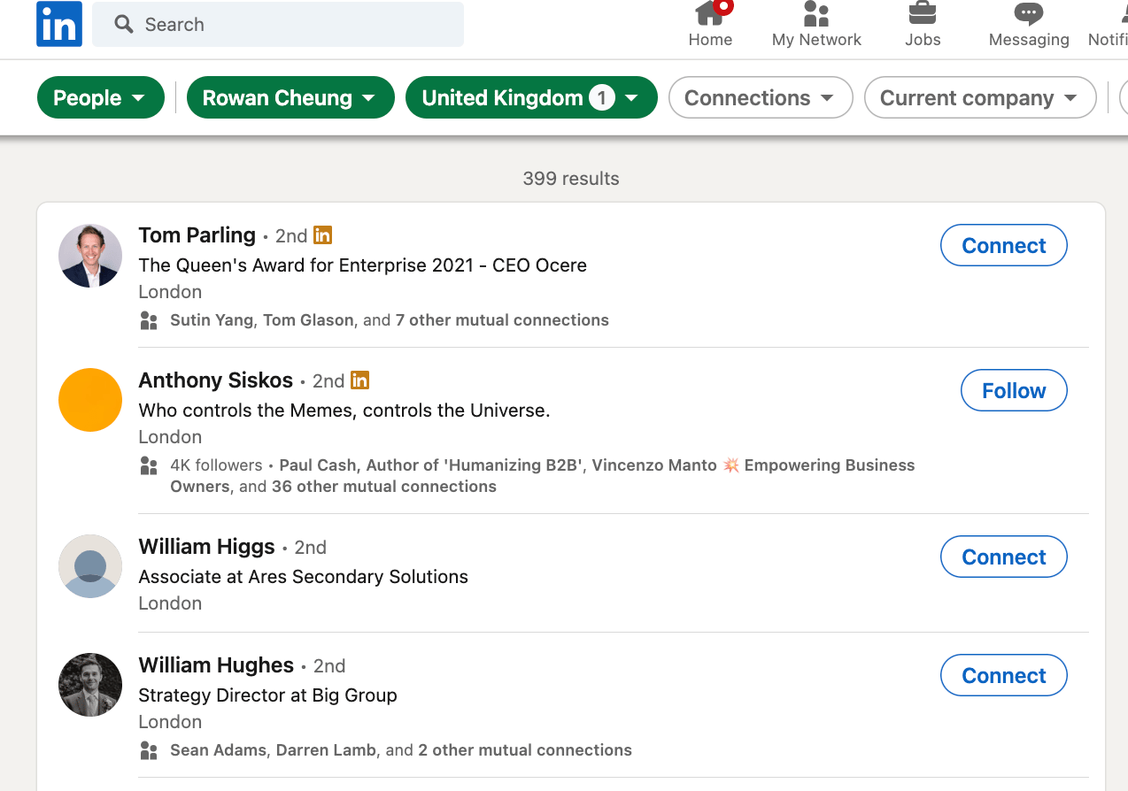 Here’s an example where I’ve pulled up the 6,400 followers of Rowan Cheung who runs the excellent Rundown AI newsletter. I’ve also set a filter to only give me people who are in the UK. This returns 399 results: