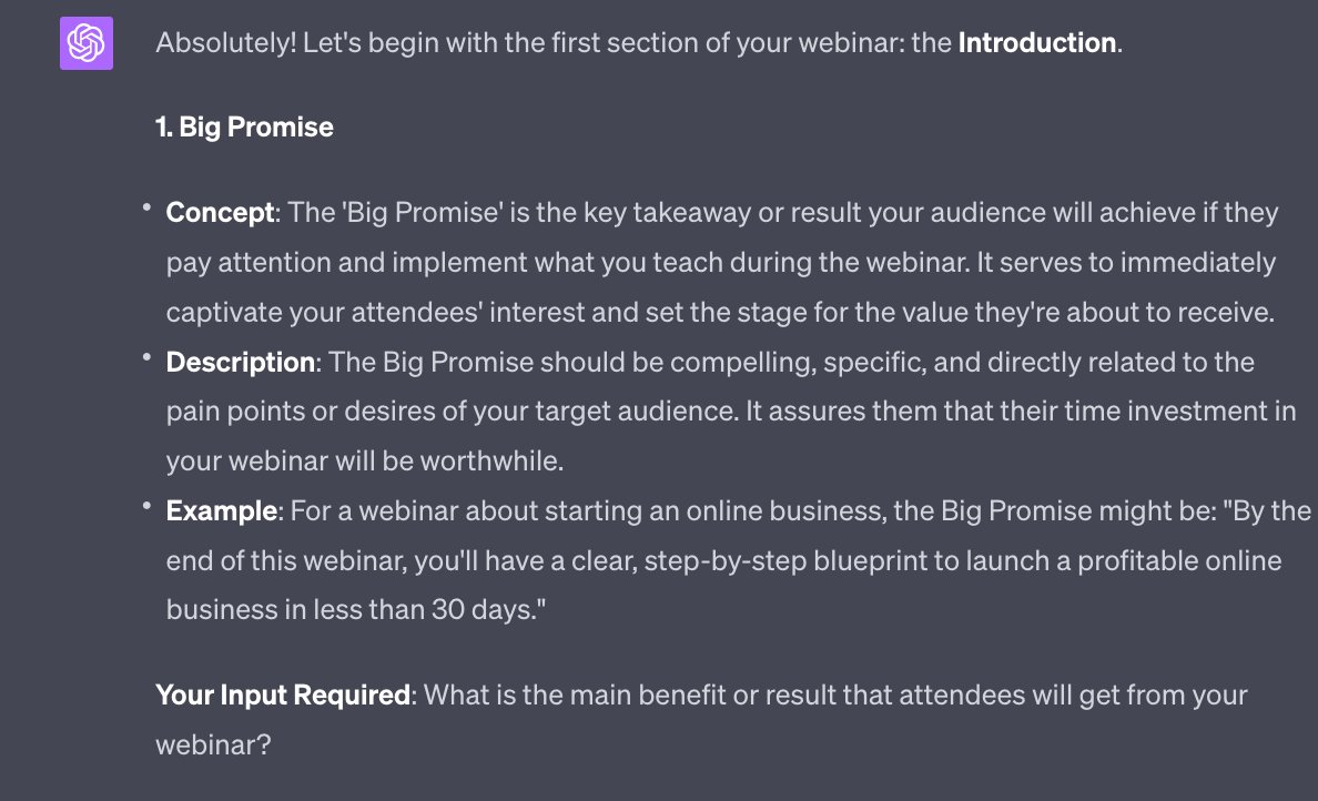 The prompt will walk you through step by step how to construct a webinar. The output above shows just the first step - ChatGPT will continue with similar explanations, examples and questions until it has all the information it needs to construct your sales webinar.