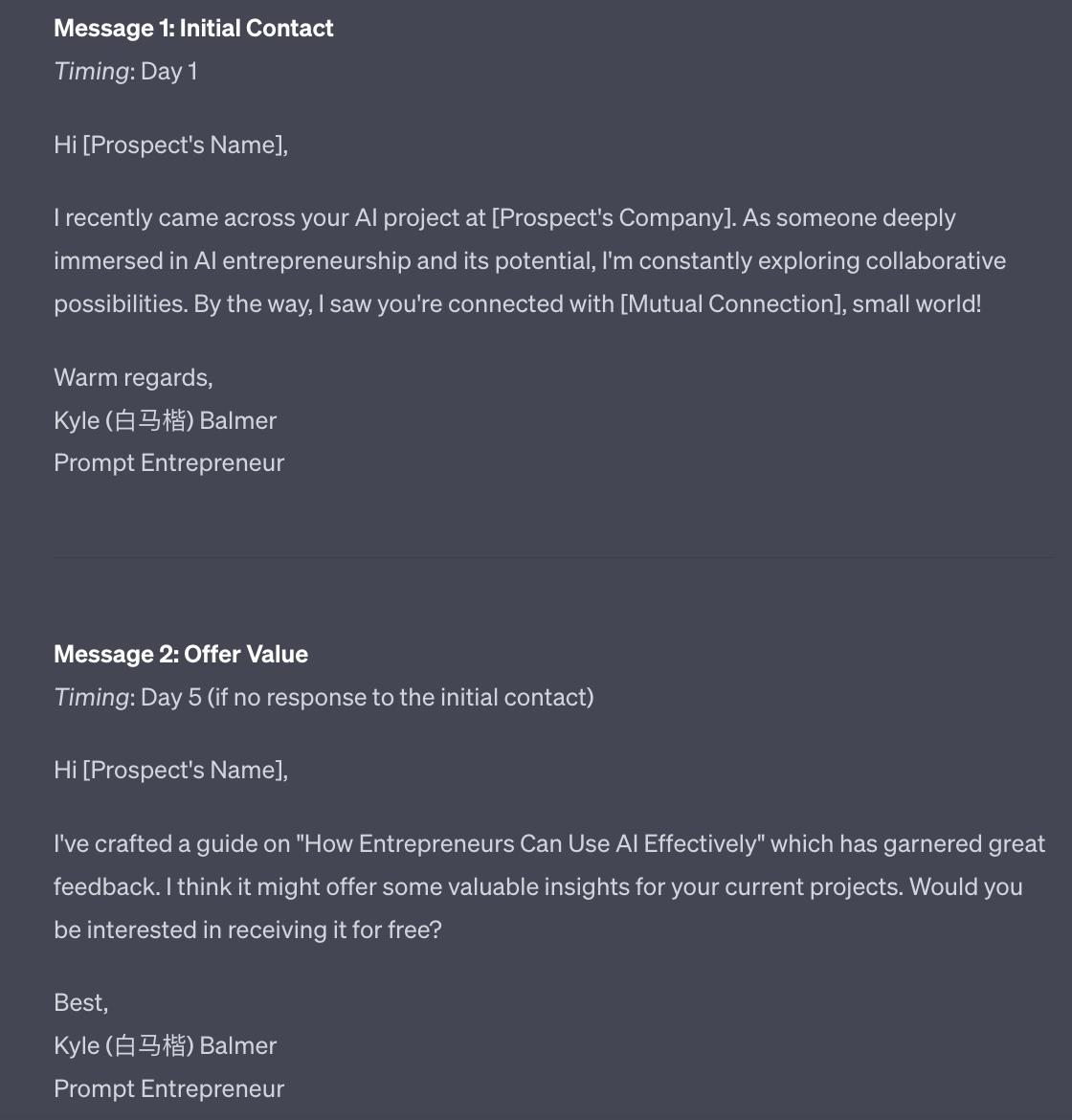Act as a LinkedIn cold outreach expert. Give me a 5 message campaign to send to a prospect, including the timings.