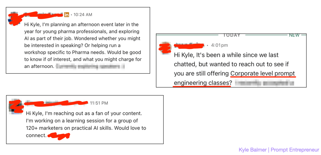 Want to know how I really started? Pure LinkedIn outreach. I simply reached out to people and companies (using automation, because I'm not a masochist) asking if they wanted AI workshops.