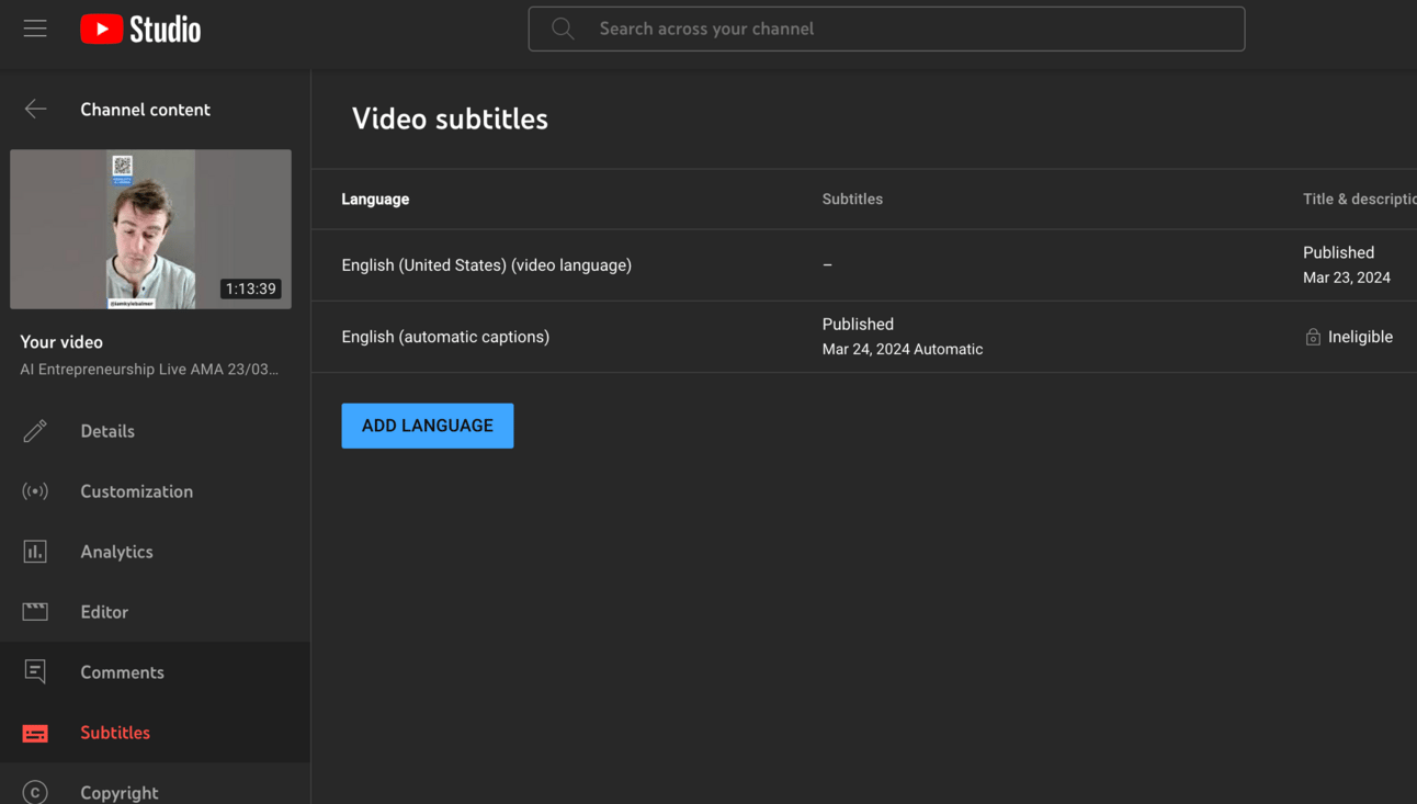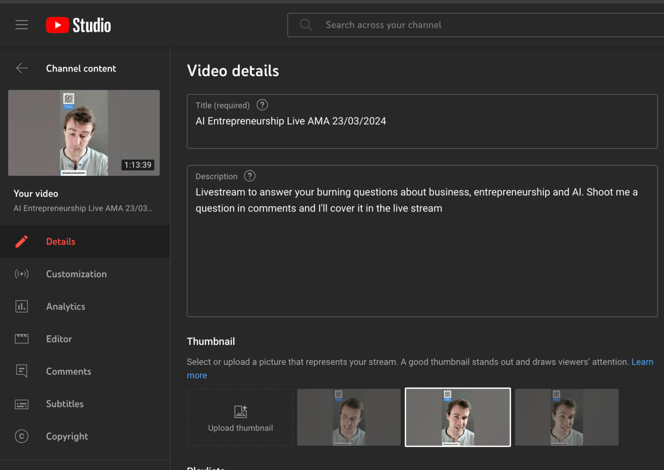 Head to Youtube Studio and Lives. There you’ll be able to see your lives’ details like so: