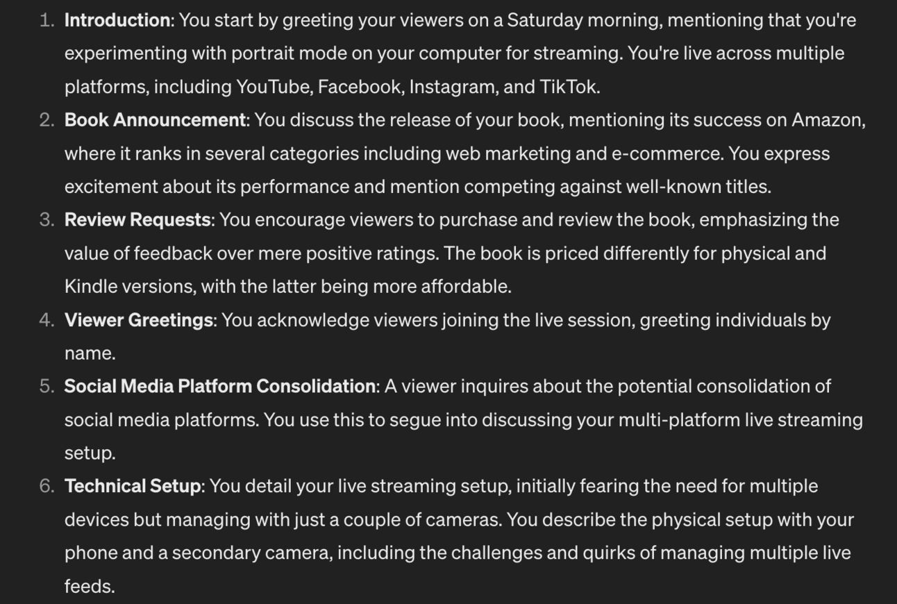 Include questions from viewers and the answersChatGPT will run through the file and give you a summary: