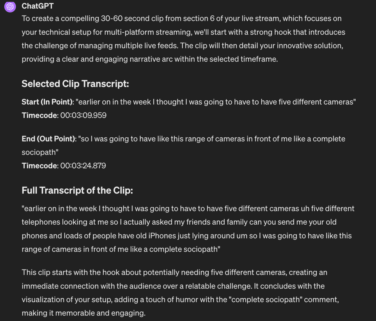Give me the in and out points of the clipI’ve used section 6 (“Technical Setup”) for this example and ChatGPT gives me this: