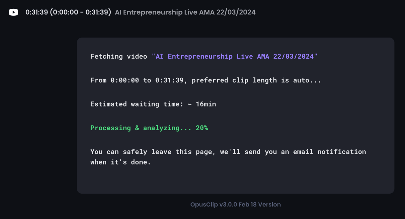 Very simply you give it the link of a long live video and it’ll analyse the video, transcribe it and find the best clips. En masse.