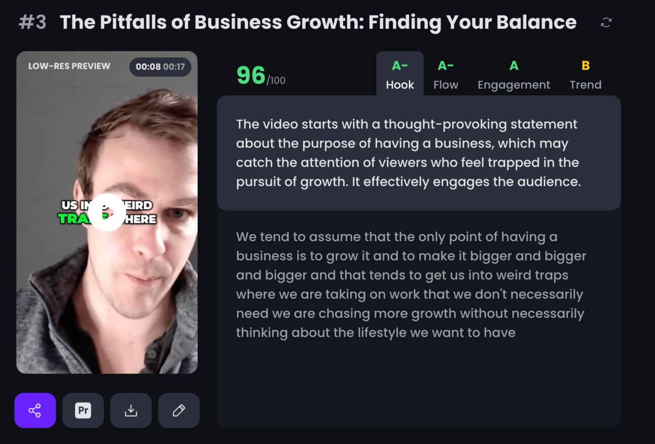 This is a 17 second clip. Notice how Opus Clips scores it on hook, flow, engagement and trend as well as gives the transcript and a quick appraisal.