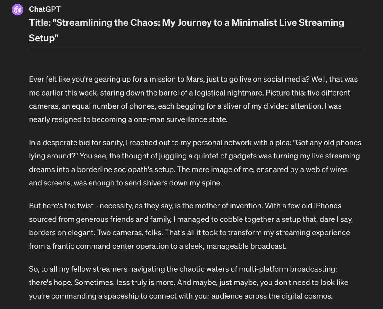 OR…and this is getting very snake eats its own tail…use this as script for a more “produced” short. Not your live but a purpose filmed short. Doing this allows you to basically use your lives to brainstorm and think things though.