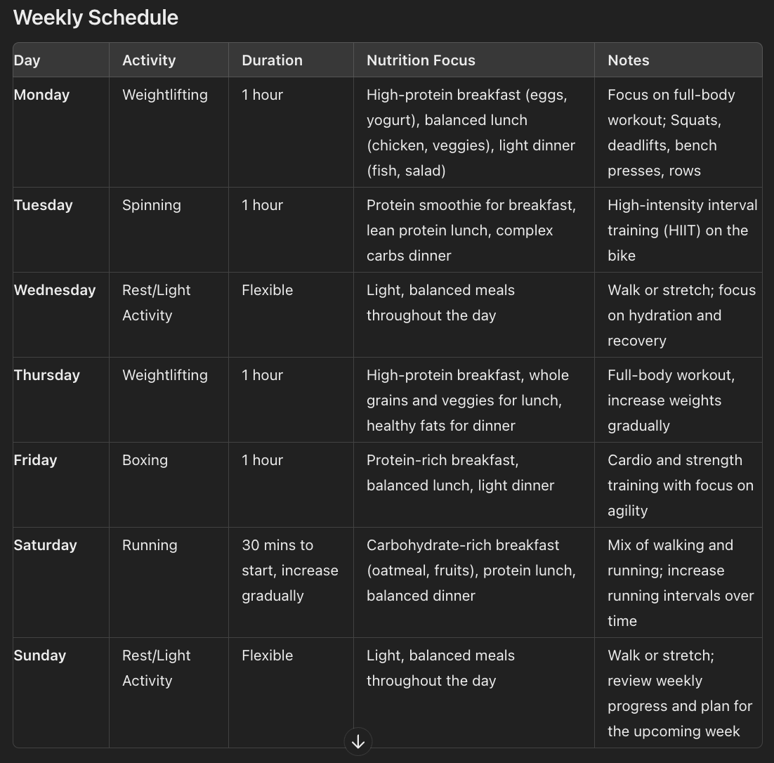 If you are goal orientated you can also feed this in during the interview. Just make sure to mention targets - for instance if you want to run a marathon or lift a certain weight. ChatGPT will add in progression over the monthly/annual schedule.
